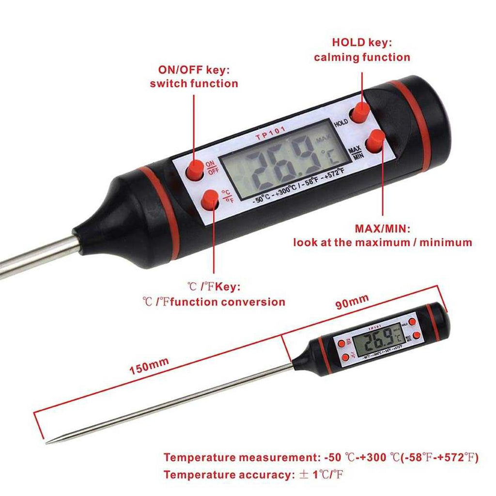Measure temperature with precision using this Digital Probe Thermometer, designed for cooking, baking, BBQ, liquids, oil, milk, chocolate, and resin/epoxy projects. With a wide temperature range from -50°C to +300°C (-58°F to +572°F), it ensures accurate and reliable readings for both kitchen and industrial use.