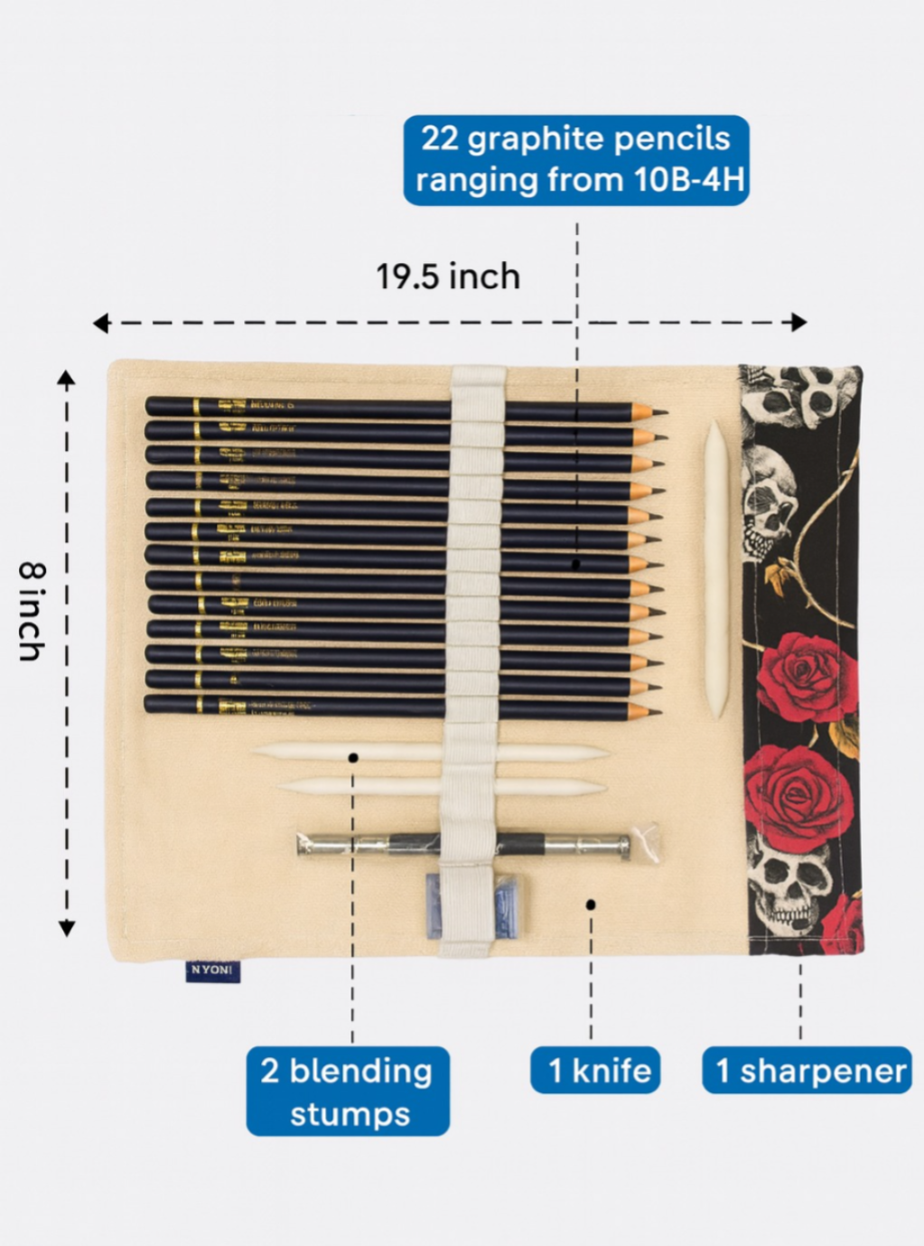 Take your sketching anywhere with this complete Nyoni drawing set in a striking skull‑and‑rose roll pouch. The sturdy canvas wrap keeps every tool secure with individual elastic loops and closes with a strong cotton tie, making it easy to carry in a bag or backpack.