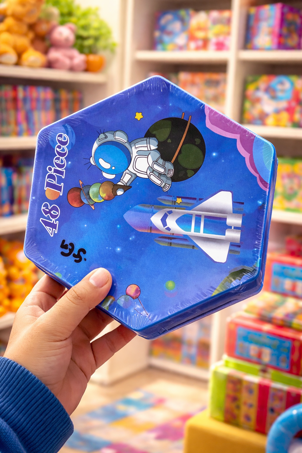Make saving money fun and exciting for kids with this Space Theme Coin Box. Designed in a unique hexagon shape, this colorful metal money box features a cute astronaut and space rocket theme that children love.